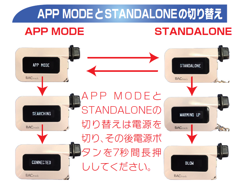 アルコールマネージャーPocketは、アプリ接続で測定する「アプリモード」の他、機器本体だけで測定できる「スタンドアローンモード」を兼ね備えています。